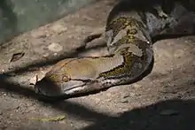 As with all pythons, the reticulated python is an ambush predator, usually waiting until prey wanders within strike range before seizing it in its coils and killing by constriction. Its natural diet includes mammals and occasionally birds. Small specimens up to 3–4 m (9 ft 10 in – 13 ft 1 in) long eat mainly small mammals such as rats, other rodents, mouse-eared bats, and treeshrews, whereas larger individuals switch to prey such as small Indian civet and binturong, primates, pigs, and deer weighing more than 60 kg (132 lb 4 oz).[42] As a rule, the reticulated python seems able to swallow prey up to one-quarter its own length and up to its own weight. Near human habitation, it is known to snatch stray chickens, cats, and dogs on occasion.[26] Among the largest documented prey items are a half-starved sun bear of 23 kg (50 lb 11 oz) that was eaten by a 6.95 m (22 ft 10 in) specimen and took some 10 weeks to digest.[28] At least one case is reported of a foraging python entering a forest hut and taking a child.[43]