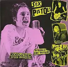 "Revolution in the Classroom" was a single released by the Ex Pistols; despite its packaging, the record has nothing to do with the Sex Pistols. The single was released in 1989 on the STP Records label, pressed on various colours of vinyl. The song, along with its B-side "Schools Are Prisons", were both included on the Ex-Pistols album, Deny. They also appear disguised as genuine Sex Pistols recordings on two Sex Pistols retrospective albums by former producer Dave Goodman, Pirates of Destiny (I Swirled Records, 1989) and We Have Cum For Your Children (Skyclad Records, 1988).[1] Under the title "Revolution" the song appears on a German Sex Pistols compilation "Anarchy in the USA" from 1992 released on MBC records. CD 084-60322 LP 008-60321