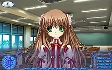 There are eight main plot lines that the player will have the chance to experience, three which are initially available and five more which can later become available.[1] Throughout gameplay, the player is given multiple options to choose from, and text progression pauses at these points until a choice is made. Some decisions can lead the game to end prematurely, which offer an alternative ending to the plot. To view all plot lines in their entirety, the player will have to replay the game multiple times and choose different choices to further the plot to an alternate direction. When first playing the game, the scenarios for the heroines Kotori, Chihaya and Lucia are available.[1] To access Sizuru's scenario, Kotori's must be completed first. Similarly, to access Akane's scenario, Chihaya's must be done first. After the plot lines for these five heroines have been completed, an additional scenario called Moon is made available. Upon the completion of the Moon route, another scenario called Terra is made available, which serves as the true conclusion to the story; both Moon and Terra revolve around the heroine, Kagari.[1]