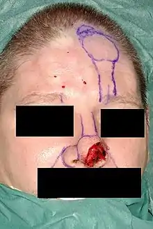 • If the nasal-tip wound is greater than 15 mm in diameter, the surgeon enlarges it to comprehend the entire aesthetic subunit affected by the defect, and the reconstruction of the nasal subunit done with a forehead flap. If the nasal-tip defect also involves the nasal dorsum, a forehead flap is indicated for reconstructing the entire nasal-tip and dorsum.