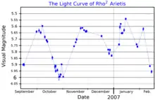A visual band light curve for Rho2 Arietis, plotted from data presented in Tabur et al. (2009)[12]