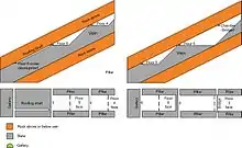 The incline from floor 5 to floor 9 was 309 feet (94 m) long, with a gradient of 1 in 1.97 at the top and 1 in 2.15 at the bottom. It follows the roof of the vein, and the change in slope is caused by the dip of the vein changing. A cradle running on standard gauge tracks runs up and down the incline. It was counterbalanced by a weighted truck running on 2 ft 8 in (813 mm) gauge tracks, running down the centre of the incline. The counterbalance passed under the main cradle, which carried trucks on three transverse tracks, at the midway point. At the bottom of the incline, the cradle descended into a pit, to that its top was level with the floor, to enable the loaded trucks to be off-loaded easily.[23] Sometime after the construction of this incline, a similar one was built between floors 3 and 6 in the western part of the mine. It sloped down at 1 in 1.26, and was 314 feet (96 m) long. From about 1890, the mine began to be extended below level 9, for which a new incline was needed. It ran from near the foot of the 5/9 incline, and descended at a gradient of 1 in 2.48 for a distance of about 436 feet (133 m) to reach floor 14. It was probably powered by a counterbalance system, since another incline was constructed from the head of the 9/14 incline up to floor 6. It was too small for it to have housed a transporter truck, but could easily have been used by a balancing truck, which would have been filled with water at floor 6 to make it heavy enough to raise the transporter on the 9/14 incline, and emptied for movement in the reverse direction. No details of it have survived, and power was provided by two Pelton wheels on floor 9 from 1899, which were supplied with water from the abandoned adit on floor 4.[24]