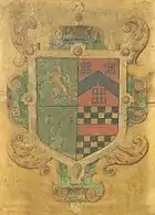 ARMS – Quarterly, 1st, Sable (black), a lion rampant within an orle of cinquefoils Or (gold); 2nd, Gules (red), a chevron Or (gold), between three bowers' knots; 3rd, Sable (black), three buck's heads cabossed Argent (silver); 4th, chequy Or (gold) and Sable (black), a fess Argent (silver).