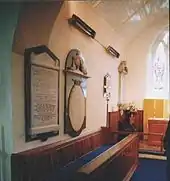 The two memorials (Pictured at right) are attached to the wall behind the family's front pew in the church. A number of the family are interred in the family vault, which lies beneath the floor under the pew.[17] Captain David John Edwardes 1787–1866 and his son Captain Frederick Augustus Edwardes 1829–1878 are buried in the churchyard behind the church.