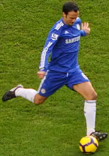 Carvalho continued his excellent form into the 2007–08 season. Following the departure of manager José Mourinho,[36] the Spanish champions, Real Madrid, have once again expressed their interest in Carvalho. A Madrid source said, "We have never been able to get Carvalho because of his connection with Mourinho. Now he has left Chelsea, we feel there's a real chance."[37] But the Portuguese did not leave the English club. On 26 December 2007, in a 4–4 home draw against Aston Villa, on the 79th minute, the home side were outmanoeuvred in the middle of the field leaving only goalkeeper Petr Čech and Carvalho between Villa's striker, Gabriel Agbonlahor, and the goal, Carvalho attempted the block, went in two-footed and was red carded for the foul,[38] in the same night, he issued a public apology for his horror tackle on the forward.[39] In that season, Carvalho was one of the most consistent performers at the club and his efforts were rewarded when he scored his first goal of the season in his 150th appearance for the club, a 1–0 Premier League victory over Middlesbrough.[40][41] Later, on 26 April, Carvalho made his 100th appearance in the Premier League against Manchester United, despite Chelsea's 2–1 win, he marred his centenary mark with an error that allowed Wayne Rooney to equalise.[42] His solid performances in the Champions League helped the club reach the final, Chelsea's first ever Champions League final appearance and Carvalho's second. The Blues, however, lost 6–5 on penalties against Manchester United after a 1–1 draw following extra time. Carvalho played in all 120 minutes and he was booked one time for a high challenge on Cristiano Ronaldo right before the end of first half.[43] On 8 May 2008, Carvalho was voted by his fellow Chelsea colleagues as Chelsea's "Players Player of the Year", while finishing in the top three for Chelsea's "Player of the Year" award voted by Chelsea fans, along with Michael Ballack and Joe Cole.[44]