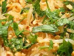 The origin of rice noodles dates back to China during the Qin dynasty when people from northern China invaded the south. Due to climatic conditions, the northern Chinese have traditionally preferred wheat and millet which grew in cold weather while the southern Chinese preferred rice which grew in hot weather. Noodles are traditionally made out of wheat and eaten throughout northern China so to adapt, northern cooks tried to prepare "noodles" using rice, thus inventing rice noodles. Over time rice noodles and their processing methods have been introduced around the world, becoming especially popular in Southeast Asia.[1] In India, idi-appam, strings of cooked rice, was known in ancient Tamil country around 1st century AD, as per references in the Sangam literature, according to food historian K. T. Achaya.[2]