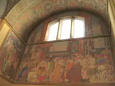 Goodhue designed the original Los Angeles Central Library with influences of ancient Egyptian and Mediterranean Revival architecture. The central tower is topped with a tiled mosaic pyramid with suns on the sides with a hand holding a torch representing the "Light of Learning" at the apex. Other elements include sphinxes, snakes, and celestial mosaics. It has sculptural elements by the preeminent American architectural sculptor Lee Lawrie, similar to the Nebraska State Capitol in Lincoln, Nebraska, also designed by Goodhue. The interior of the library is decorated with various figures, statues, chandeliers, and grilles, notably a four-part mural by illustrator Dean Cornwell depicting stages of the History of California which was completed around 1933.[15] The building is a designated Los Angeles Historic-Cultural Monument, and is on the National Register of Historic Places.