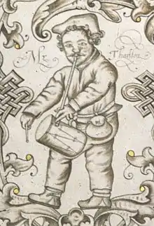 He was Queen Elizabeth's favourite clown. He had a talent for improvising doggerel on subjects suggested by his audience; in fact, improvised doggerel verse became known for a time as "Tarltons".[5] To cash in on his popularity, a great number of songs and witticisms of the day were attributed to him, and after his death the text Tarlton's Jests, containing many jokes in fact older than he was, made several volumes. Other books, and several ballads, coupled his name with their titles. Some have suggested that the evocation of Yorick in Hamlet's soliloquy was composed in memory of Tarlton.[3]