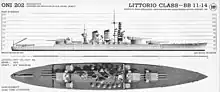 The Richelieu class were fast battleships built for the French Navy between the 1930s and 1950s. Initially two ships were ordered in 1935 in response to Italian orders for the Littorio-class battleships the previous year. The Richelieus were based on the preceding Dunkerque class, but scaled up to accommodate more powerful 380 mm (15 in) guns and armor to protect them from guns of the same caliber. To keep the ships within the displacement limits imposed by the Washington Naval Treaty, they featured the same concentrated arrangement as the Dunkerques for the main battery: two quadruple gun turrets placed forward. They also incorporated new, more compact boilers that allowed for a shorter hull (which required less heavy armor) for the desired top speed. After Germany ordered two Bismarck-class battleships, France responded with another pair of Richelieus, to be built to modified designs. The first, Clemenceau, would have received modified secondary and anti-aircraft batteries, while Gascogne would have had had her superfiring main battery turret shifted aft, along with other changes. Clemenceau was never completed, and Gascogne was never laid down.