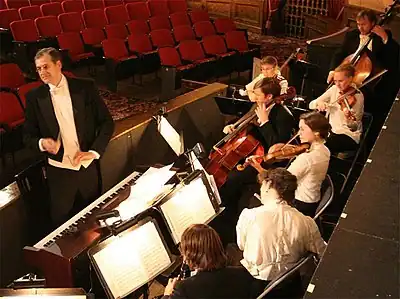 In 1986 Benjamin decided to form a 14-piece orchestra of fellow Juilliard students to perform the music as it had been originally arranged during the period.[1][5][7][8] Benjamin made a request to Juilliard to perform a concert of turn-of-the-20th-century American composers but his request was rejected by Juilliard's dean, who felt Juilliard should focus on traditional composers.[9] Benjamin scheduled a Mozart program on solo tuba at a concert hall, but instead led a group in performing ragtime music, leaving open the doors to draw in a wider crowd.[3][9] Before a full house, Benjamin's group played selections by Irving Berlin and Victor Herbert, the W.C. Handy's "Memphis Blues" and Joplin's "Peacherine Two-Step."[2] One witness to the event, Juilliard professor Vincent Persichetti, approached Benjamin after the concert was over to encourage him to make it his "life's work" to preserve "America's original music."[2]
