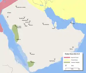 The Ridda Wars (Arabic: حُرُوْبُ الرِّدَّةِ, lit. 'Apostasy Wars')[1] were a series of military campaigns launched by the first caliph Abu Bakr against rebellious Arabian tribes. They began shortly after the death of the Islamic prophet Muhammad in 632 and concluded the next year, with all battles won by the Rashidun Caliphate.[2] These wars secured the caliphate's control over Arabia and restored its nascent prestige.