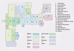 In 1872, during the tenure of the Earl of Dufferin, the indoor Tennis Court and the ballroom were added to the western end of the house, arranged to the south and north, respectively, of the main entrance. The ballroom is a structure of heavy timber framing with brick infill and finished stone exterior.[68] Then, when the Earl of Minto arrived in 1898 with his large family and household, the Minto wing was constructed on the east end of Rideau Hall and was completed in the following year, though this was again intended to only be a temporary measure until a proper government house could be built.[69] Minto's successor, the Earl Grey, added the governor general's study to the far east end of the Monck wing, thus symmetrically balancing out the curved bay and pediment of the original McKay villa to the west.