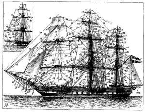 Fully rigged ship: three or more (all) square-rigged masts and headsails