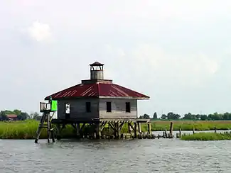 As a deepwater tidal pass, the Rigolets helps supply salt water from the Gulf to Lake Pontchartrain.[3] Tidal scouring has produced a deep pit in the lake at the western mouth of the strait.[4] Since the Rigolets is a channel through which Gulf storm surges can approach the New Orleans area, there have been proposals to construct floodgates to try to protect the city, especially since the destructiveness of hurricanes in the early 21st century.[5]