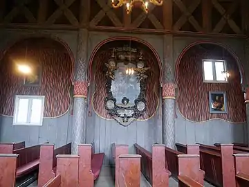 Later restoration in 1921 brought it back a bit closer to its original shape. At one point the church was painted white within, but during the restoration work by Ragnvald Einbu in 1921 the church interior was restored to its original colouring.[12][6]