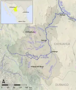 The Rio Conchos is the main river in the state of Chihuahua and the Rio Grande's largest tributary.[4] It is one of the most important river systems in all of northern Mexico.[2] The Conchos has several reservoirs that make use of its water for agricultural and hydropower uses.