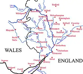 ![]() Tributaries (light blue) and major settlements on and near the Severn (bold blue) | |