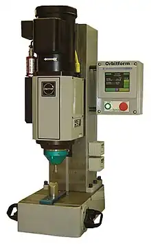 A riveting machine is used to automatically set (squeeze) rivets in order to join materials together. The riveting machine offers greater consistency, productivity, and lower cost when compared to manual riveting.[1][2]