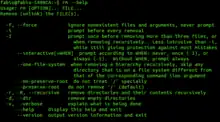 -r, "recursive," which removes directories, removing the contents recursively beforehand (so as not to leave files without a directory to reside in).-i, "interactive" which asks for every deletion to be confirmed.-f, "force," which ignores non-existent files and overrides any confirmation prompts (effectively canceling-i), although it will not remove files from a directory if the directory is write-protected.-v, "verbose," which prints whatrmis doing onto the terminal-d, "directory," which deletes an empty directory, and only works if the specified directory is empty.--one-file-system, only removes files on the same file system as the argument, and will ignore mounted file systems.