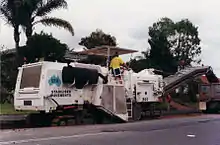 A road recycler or road reclaimer is an asphalt pavement grinder or a combination grinder and soil stabilizer when it is equipped to blending cement, foamed asphalt and/or lime and water with the existing pavement (usually only very thin asphalt) to create a new, recycled road surface. It usually refers to the process of blending the asphalt road with a binder and base course in a single pass.[2] In the photo below of the milling cutter drums, the front drum with many teeth would be from a pavement mill and would be used to remove very hard asphalt or concrete surfaces. The drums behind with less teeth would be from a road recycler, the teeth are placed in a chevron pattern to reduce the load on the motor. Only a few teeth are cutting at one time and this pattern of teeth placement also serves to auger the material to the centre where it can be picked up easily by a conveyor belt.