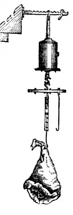 A roasting jack is a machine which rotates meat roasting on a spit.[1] It can also be called a spit jack, a spit engine or a turnspit, although this name can also refer to a human turning the spit, or a turnspit dog.[2] Cooking meat on a spit dates back at least to the 1st century BC, but at first spits were turned by human power. In Britain, starting in the Tudor period, dog-powered turnspits were used; the dog ran in a treadmill linked to the spit by belts and pulleys. Other forms of roasting jacks included the steam jack, driven by steam, the smoke jack, driven by hot gas rising from the fire,[3][4] and the bottle jack or clock jack, driven by weights or springs.
