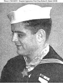 Bush joined the United States Naval Reserve (United States Navy Reserve) at age 17 on January 5, 1944, as an apprentice seaman, Class V-6, at Navy Recruiting Station, Seattle, Washington.[2] After completing recruit training at the Farragut Naval Training Station, at Farragut, Idaho, he was sent to and graduated from the Naval Hospital Corps Schools in Farragut.[2] He was assigned to the Naval Hospital, Seattle, before completing further training at the Field Medical Service School, Fleet Marine Force Training Center, Camp Pendleton, California.[3] During his training, he was advanced to seaman second class then to hospital apprentice second class. On March 1, he was temporarily advanced to hospital apprentice first class.