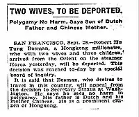 the New York Times reported in 1908 that "Robert Ho Tung Bosman... with two wives and three children.. will be deported"