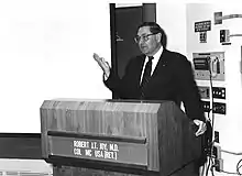 After completing the Armed Forces Staff College, Joy was assigned to the Medical Research Division of the Office of the Army Surgeon General, where he would serve for the next 18 months.[30] This was a time of great import for the research enterprise in the AMEDD, where a major portion of the Departments $51.4 million research program was devoted to solving specific problems relevant to ongoing operations in the Republic of Vietnam. It was also a period that saw the Medical Unit, Self-contained, Transportable (MUST) hospital equipment set, originally approved for use in Vietnam, certified for worldwide deployment in the full range of operational environments, and the approval of a major research and development construction program which would have consolidated Army Medical R&D facilities from 13 sites to six, while increasing the Army's in-house medical research capability by some 40%.[31][32]