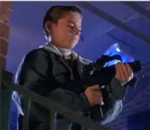 RoboCop suit designer Rob Bottin, although not overseeing the process like in the first film, returned to produce a new suit for the second film. The first suit was dark chrome using metal flake and various green, purple, and gold colors to create a look made iridescent and steel-like by Jost Vacano's fluorescent lighting; however, since Mark Irwin replaced Vacano for cinematographer and used conventional lighting, the second film suit (although using a black base like the other suit) looked light-bluer, so iridescent colors were more directly applied with powder.[45] Thanks to a bigger budget, the effects team had more time to paint and polish the suit, which led to Bottin's desired "show car" look he couldn't achieve in the first.[46] With a lot of planning and fastener hunting, Bottin also built all parts of the suit to come on and off quickly so that it couldn't decay from the actor having it on too long, which was the case of the first film.[47]