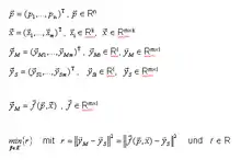 The robot errors gathered by pose measurements can be minimized by numerical optimization. For kinematic calibration, a complete kinematical model of the geometric structure must be developed, whose parameters can then be calculated by mathematical optimization. The common system behaviour can be described with the vector model function as well as input and output vectors (see figure). The variables k, l, m, n and their derivates describe the dimensions of the single vector spaces. Minimization of the residual error r for identification of the optimal parameter vector p follows from the difference between both output vectors using the Euclidean norm.
