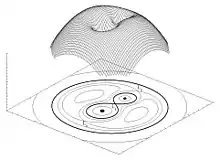 A three-dimensional representation of the Roche potential in a binary star with a mass ratio of 2, in the co-rotating frame. The droplet-shaped figures in the equipotential plot at the bottom of the figure define what are considered the Roche lobes of the stars. L1, L2 and L3 are the Lagrangian points where forces (considered in the rotating frame) cancel out. Mass can flow through the saddle point L1 from one star to its companion, if the star fills its Roche lobe.[1]