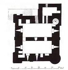 Keeps were traditionally built with an entrance at first-floor level, and Rochester's follows this pattern.[79] A forebuilding attached to the north side guarded the entrance. A stone staircase began on the west side of the keep before turning and meeting the forebuilding, which could be entered by crossing a drawbridge across a gap 9 feet (2.7 m) wide. There was another entrance in the west of the forebuilding, and at some point a new doorway was knocked through to the keep at the bottom of the drawbridge pit. The original door from the forebuilding into the keep was protected by a portcullis.[77]