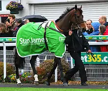 Rock On Ruby is a bay horse bred in Ireland by John O'Dwyer. He is one of many successful jumpers (including Oscar Whisky, Big Zeb and Lord Windermere) sired by Oscar, a son of Sadler's Wells based at the Grange Stud in County Cork.[3] His dam Stony View never raced but has produced at least two other winners. Rock On Ruby was first offered for sale as a foal in November 2005 when he was bought for €23,000 by the Whitehorse Stud. As a four-year-old gelding, he was sent to the Doncaster sales in May 2009 where he was bought for £23,000 by Richard Barber and entered the ownership of the Festival Goers syndicate.[4] Although the horse was officially trained by Paul Nicholls at Ditcheat in Somerset, he was actually stabled twenty-five miles away in Nicholls' satellite yard at Seaborough in Dorset where his day-to-day conditioning was handled by the assistant trainer Harry Fry.[5]