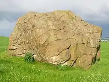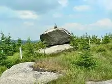 Rocking stones (also known as logan stones or logans) are large stones that are so finely balanced that the application of just a small force causes them to rock. Typically, rocking stones are residual corestones formed initially by spheroidal weathering and have later been exposed by erosion or glacial erratics left by retreating glaciers.[1][2] Natural rocking stones are found throughout the world.[2] A few rocking stones might be man-made megaliths.