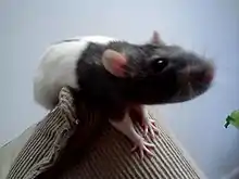 Fancy rats first became popular pets in 19th-century England when selectively bred for unusual colouration.[11] They are prohibited in Alberta, Canada, outside of schools, laboratories, and zoos. Fancy rats enjoy the company of their own kind; it is common to keep domestic rats paired together with companions of the same sex; rats housed with the opposite sex will breed rapidly. Whereas mice prefer independence, domestic rats enjoy the company of their owner. Female rats may become pregnant as early as five weeks old; producing a litter of about eight young each time, and are able to become pregnant again within 24 hours.[12] Rats have sharp teeth that never stop growing, and will chew objects such as wood to shave down their teeth to an appropriate length. Wild rats have different diets depending on location. Rats are opportunistic eaters; in the wild, rats are herbivores, as they will scavenge for seeds, plants and fruits. Due to a lack of easily accessible produce in the city, city rats will eat nearly anything, including trash and meat. Domestic rats live slightly longer than wild rats, with life spans of around two years.[13]