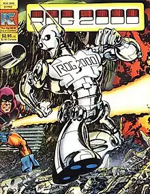 On the strength of that fan piece, Charlton Comics writer Nicola Cuti contacted Byrne about drawing the character for professional comic books.[4] During this same period, the CPL Gang was producing the officially sanctioned fanzine Charlton Bullseye.[5] Written by Cuti, "Rog-2000" became one of several alternating backup features in the Charlton Comics superhero series E-Man, starting with the eight-page "That Was No Lady" in issue #6 (Jan. 1975).[6] This marked the color-comics debut of future industry star Byrne,[7] who'd previously drawn a two-page story for Skywald Publications' black-and-white horror-comics magazine Nightmare #20 (Aug. 1974). The character also appeared the same month in the small-press hobbyist magazine The Comic Reader #44 (Jan. 1975).