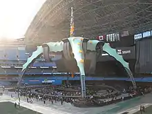 The stadium was renamed "Rogers Centre" following the 2005 purchase of the stadium by Rogers Communications, the corporation that also owns the Toronto Blue Jays.[1][12] The venue is noted for being the first stadium to have a fully retractable motorized roof, as well as for the 348-room hotel attached to it with 70 rooms overlooking the field.[13] It is also the last North American major-league stadium built to accommodate both football and baseball. The stadium served as the site of both the opening and closing ceremonies of the 2015 Pan American Games (renamed the Pan-Am Dome or Pan-Am Ceremonies Venue due to sponsorship regulations).[14]