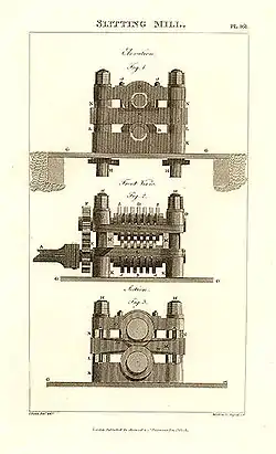 The earliest rolling mills in crude form but the same basic principles were found in Middle East and South Asia as early as 600 BCE. The invention of the rolling mill in Europe may be attributed to Leonardo da Vinci in his drawings.[3] Earliest rolling mills were slitting mills, which were introduced from what is now Belgium to England in 1590. These passed flat bars between rolls to form a plate of iron, which was then passed between grooved rolls (slitters) to produce rods of iron.[4] The first experiments at rolling iron for tinplate took place about 1670. In 1697, Major John Hanbury erected a mill at Pontypool to roll 'Pontypool plates' – blackplate. Later this began to be rerolled and tinned to make tinplate. The earlier production of plate iron in Europe had been in forges, not rolling mills.
