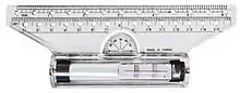 A rolling ruler is a ruler that contains a cylinder much like a rolling pin inside, thereby enabling it to "roll" along a sheet of paper or other surface where it is being used. A rolling ruler can draw straight, parallel lines, and also has other instruments included, enabling it to do the jobs of a protractor and compass.[1][2]