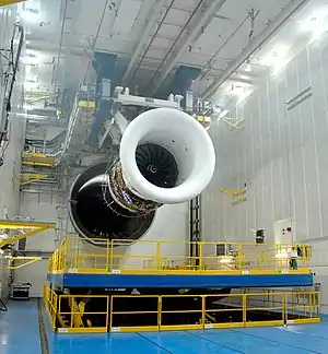 | A Trent turbofan engine installed on a test bench at the Rolls-Royce Test Facility in Derby, UK. | |