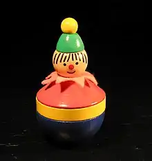 A roly-poly toy, round-bottomed doll, tilting doll, tumbler, wobbly man, or wobble doll is a round-bottomed toy, usually egg-shaped, that tends to right itself when pushed at an angle, and does this in seeming contradiction to how it should fall. The toy is typically hollow with a weight inside the bottom hemisphere. The placement of this weight is such that the toy has a center of mass below the center of the hemisphere, so that any tilting raises the center of mass. When such a toy is pushed over, it wobbles for a few moments while it seeks the upright orientation, which has an equilibrium at the minimum gravitational potential energy.