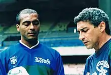 Romário is regarded as one of the greatest and most prolific strikers of all time.[7][62][63][48][64] His coach at Barcelona, Johan Cruyff, defined him as a "genius of the goal area", as well as the greatest player he ever coached.[13][65] His Brazilian compatriot Ronaldo, who played with him in his early career, reflected, "Romário was the most decisive player who I played with, he was a great goal scorer, finisher, skillful, opportunist. I think I learnt all of that from him".[66] Italian playmaker Roberto Baggio said "Romário is one of the greatest players of all time. He is a master of art in the penalty area,"[67] a view echoed by Paolo Maldini with, "Romário was incredible in the penalty area."[68] Diego Maradona on who was the best player he ever saw play, "It is between Romário and Van Basten".[69] Romário wore the number 11 shirt for most of his club and international career, which inspired Neymar's number at Santos (he also went on to wear number 11 for Barcelona).[70]