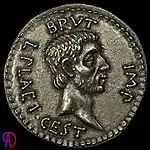 | Denarius minted in the name of Caesar by L. Aemilius Buca 44 BC. RRC 480/4 | |