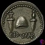 | Head Brutus Right. BRVT IMP, L.PLAET.CEST | Two daggers flanking pileus. EID.MAR |