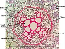 At this point, the cork cambium begins to form the periderm, consisting of protective cork cells. The walls of cork cells contains suberin thickenings, which is an extra cellular complex biopolymer.[13] The suberin thickenings functions by providing a physical barrier, protection against pathogens and by preventing water loss from the surrounding tissues. In addition, it also aids the process of wound healing in plants.[14] It is also postulated that suberin could be a component of the apoplastic barrier (present at the outer cell layers of roots) which prevents toxic compounds from entering the root and reduces radial oxygen loss (ROL) from the aerenchyma during waterlogging.[15] In roots, the cork cambium originates in the pericycle, a component of the vascular cylinder.[15]