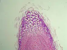 Root morphology is divided into four zones: the root cap, the apical meristem, the elongation zone, and the hair.[3] The root cap of new roots helps the root penetrate the soil. These root caps are sloughed off as the root goes deeper creating a slimy surface that provides lubrication. The apical meristem behind the root cap produces new root cells that elongate. Then, root hairs form that absorb water and mineral nutrients from the soil.[4] The first root in seed producing plants is the radicle, which expands from the plant embryo after seed germination.