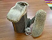 Bast shoes are made from bast fibres. They were traditional shoes of the peoples of the taiga forests of northern Europe and Russia. Bast shoes were an item worn by the rural poor; leather was preferred in cities. Bast shoes were time-consuming to make. The bark from three or four saplings was soaked in a press for a long period. Despite this, the shoes were somewhat disposable, only lasting a week or so.[2] Bast shoes were used until the mid-twentieth century. They did not always have a rope-like sole as in the picture. Perhaps more commonly they were crudely woven strips of bark.[3]
