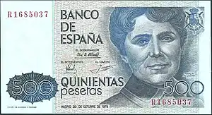 On 23 October 1979, the last of the 500 peseta bills was printed, being that in 1987, this bill was to be substituted by a coin of the same value. The bill had the portrait of Rosalía de Castro displayed on the obverse side, created by Pablo Sampedro Moledo: on the reverse side were the House/Museum of Rosalía located in Padrón and a few handwritten verses from Rosalía de Castro's work Follas Novas. With the printing of this bill, Rosalía de Castro became, excepting Isabella I of Castile, the only non-allegorical female to be placed on the obverse side of a Spanish bill.[56][57]