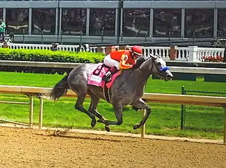 Napravnik began 2011 with a win in the Louisiana Derby, riding Pants on Fire, becoming the first woman to win that race.[21] When she was named the leading rider at that track in 2011, with 110 wins,[39] she was also the first woman rider to win the title.[40] She then became only the sixth woman to ride in the Kentucky Derby.[41] riding Pants on Fire to a 9th place finish, the best placing for a woman rider in the history of the Derby to that date.[42] She also was second in the 2011 Kentucky Oaks, riding a longshot filly named St. John's River.[21] In July of that year, Napravnik fractured her arm again when the horse she was riding broke down on the track and fell. This time the fracture was just above the plate in her wrist that had repaired her first break, an injury that required a three-hour surgery and replacement of the wrist plate with a larger one.[43]