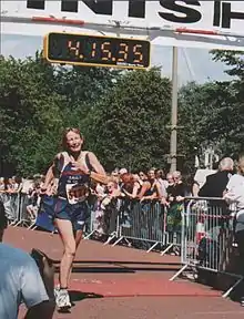 To mark the millennium, Rosie Swale achieved a long-standing ambition and successfully completed the challenging 'Comrades Marathon', one of the world's oldest and largest ultramarathons, run over a distance of approximately 90 km (56 mi) between the capital of the Kwazulu-Natal Province of South Africa, Pietermaritzburg, and the coastal city of Durban. The direction of the race alternates each year between the up run starting from Durban and the down run starting from Pietermaritzburg. Equivalent to running two marathons, Rosie Swale-Pope completed it in 11 hours 1 minute 1 second.[4] She was awarded a bronze medal for completing the race, which has been described as the roadrunner's equivalent to climbing Mount Everest.[17]